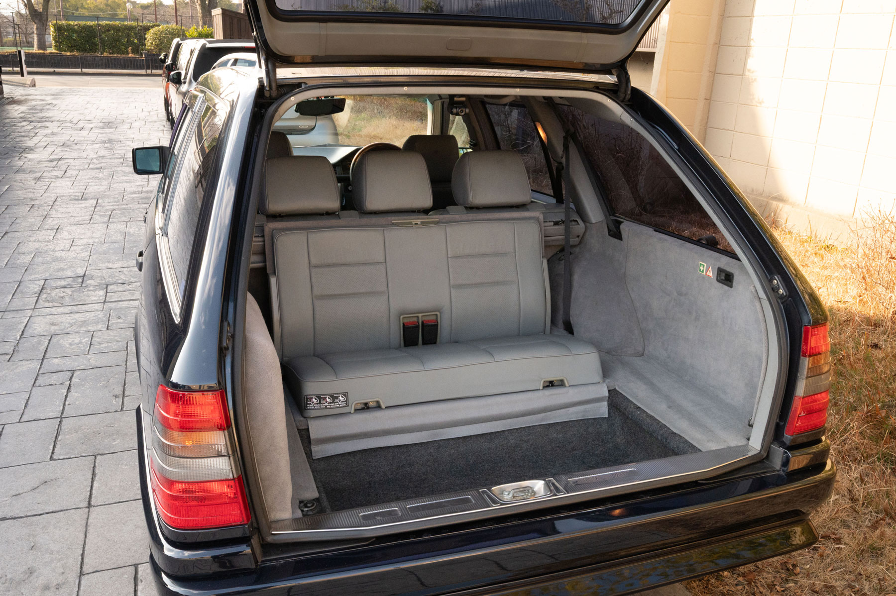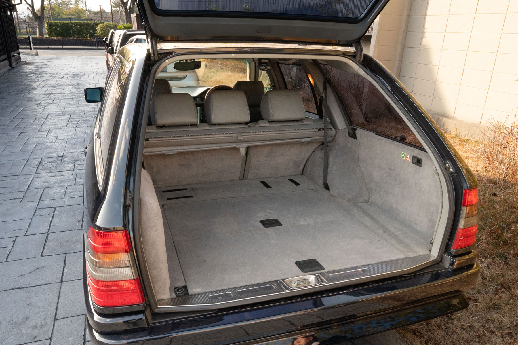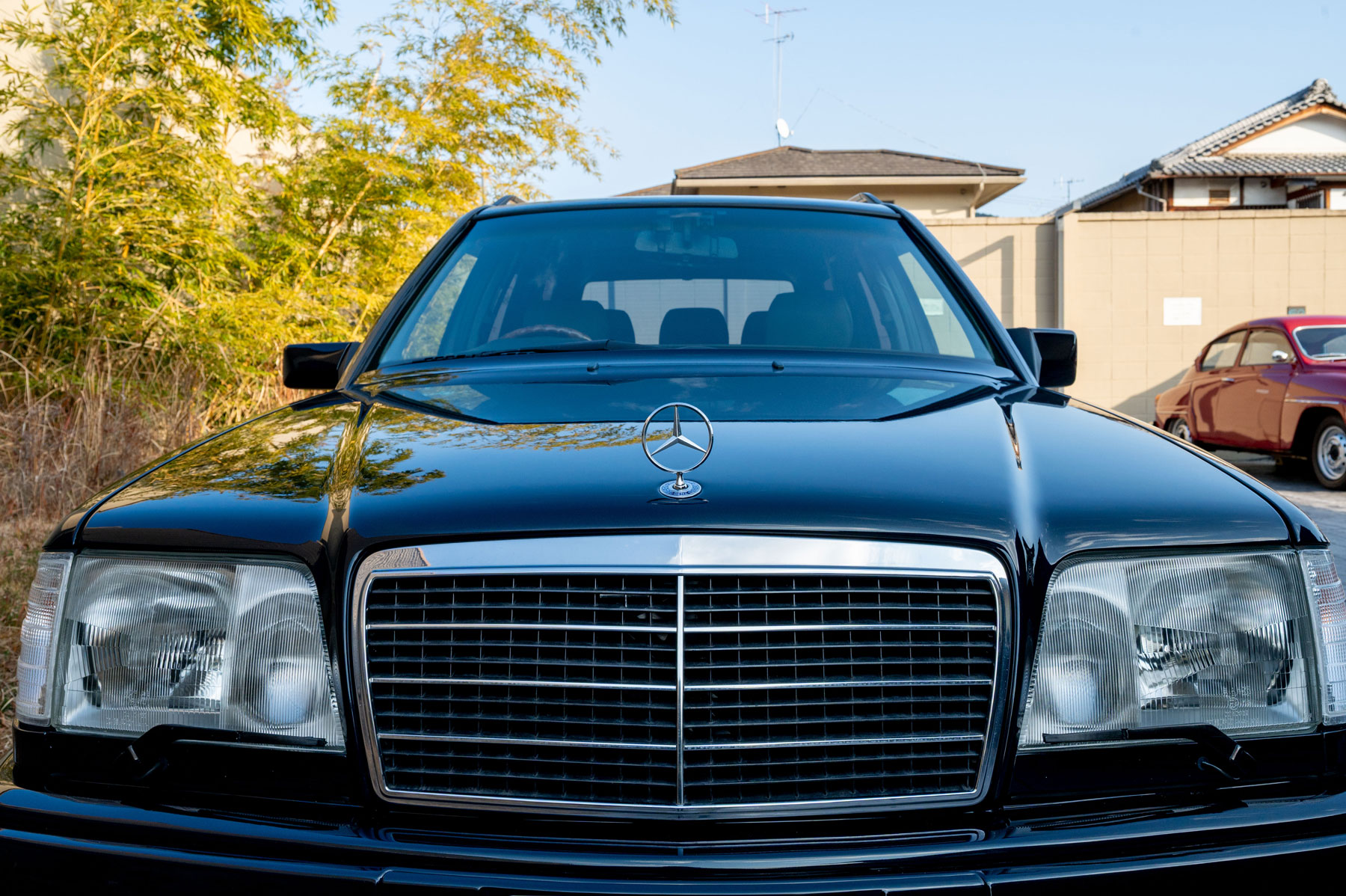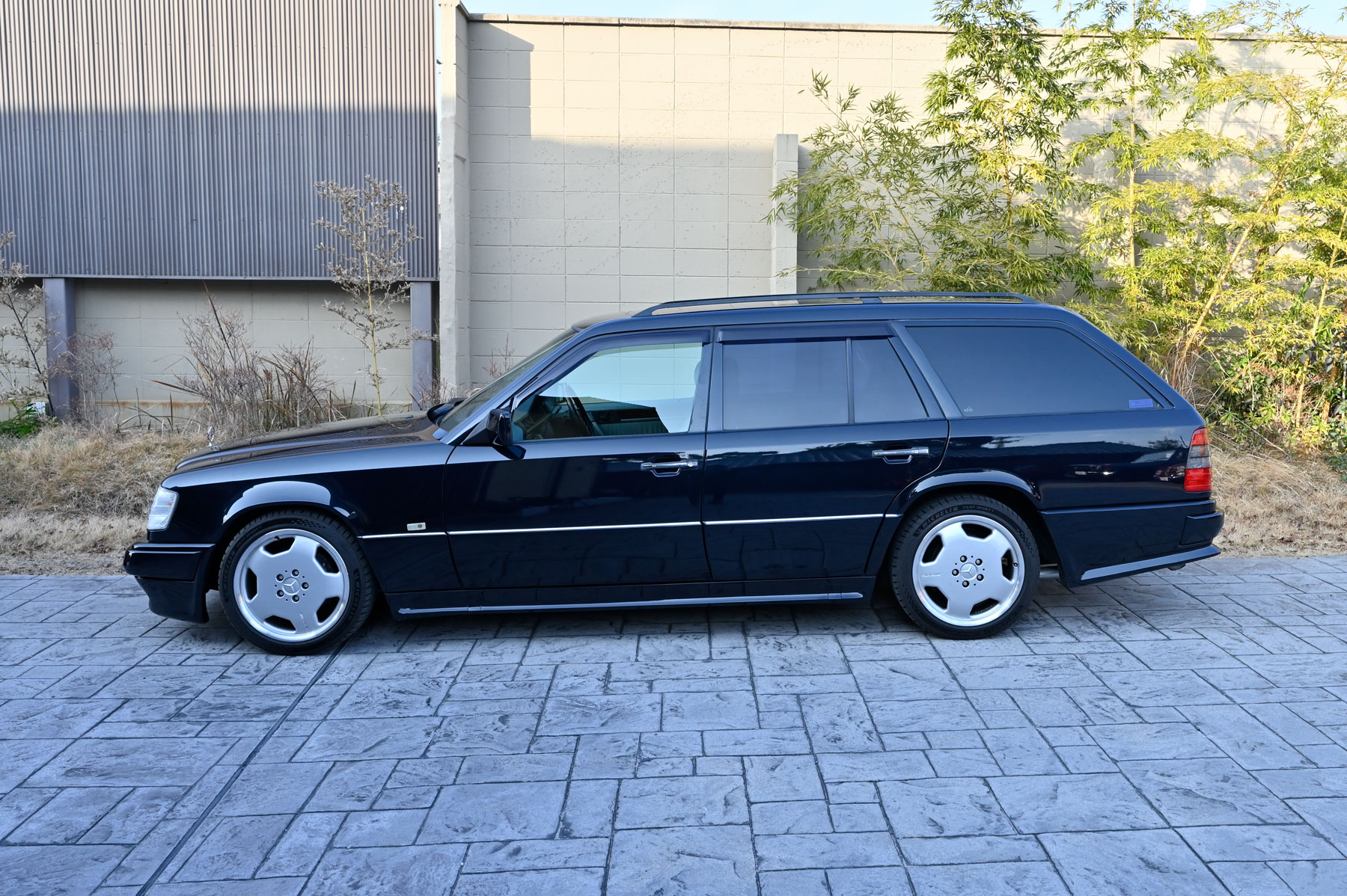 車体番号から1995年モデルを確認しております。これはW124、S124シリーズのラストイヤー、また最終リリースされた「リミテッド」グレード、リミテッド専用色サファイヤブラックです。一見濃紺にも見えますね。専用のインテリア、ウッドハンドル仕様も維持。目を引く低い外観は、AMGモデルで当時少数輸入されたE36のパーツでカスタムされています。E36用ラバー製オーバーフェンダーは装着されていないものの、非常に上質なカスタム、実は超空力デザインの124の特徴を引き立てる良い雰囲気です。アイバッハ製スプリングで少しローダウンされています。強固なシャシーとの相性も悪くない印象。