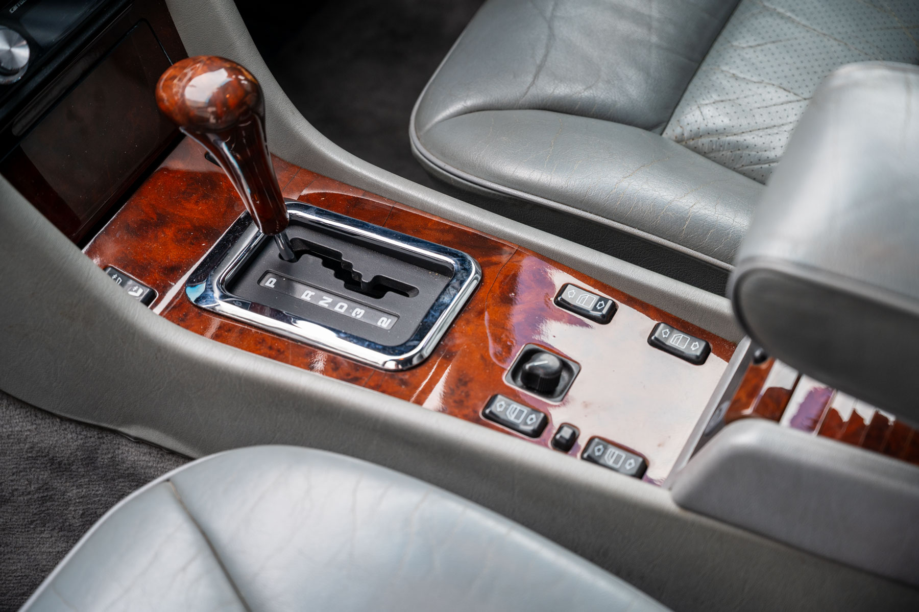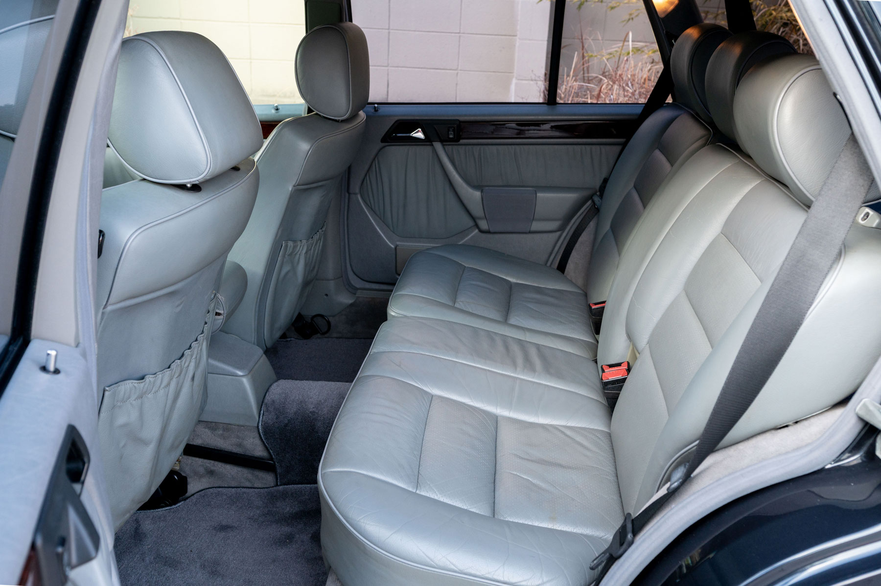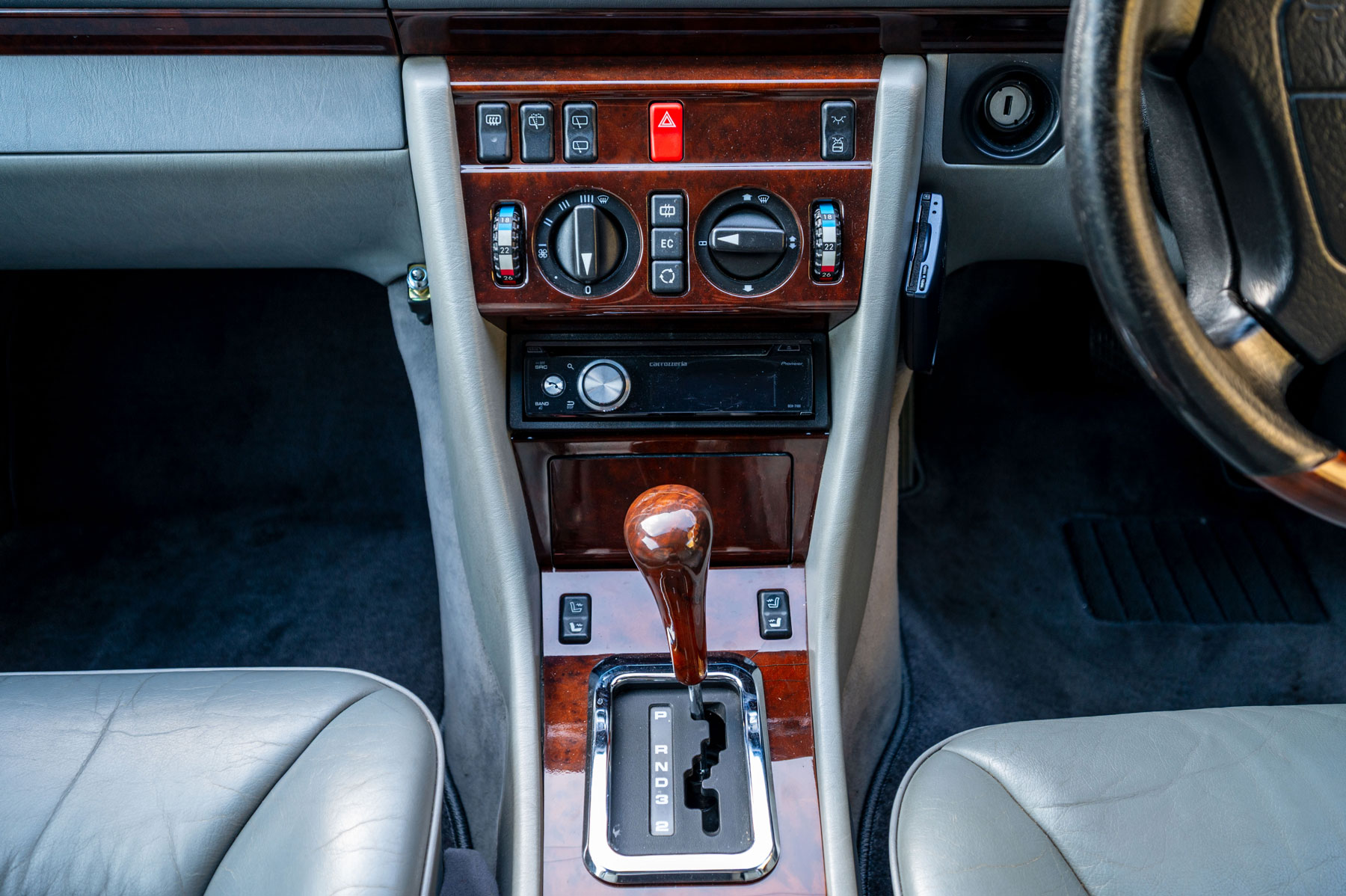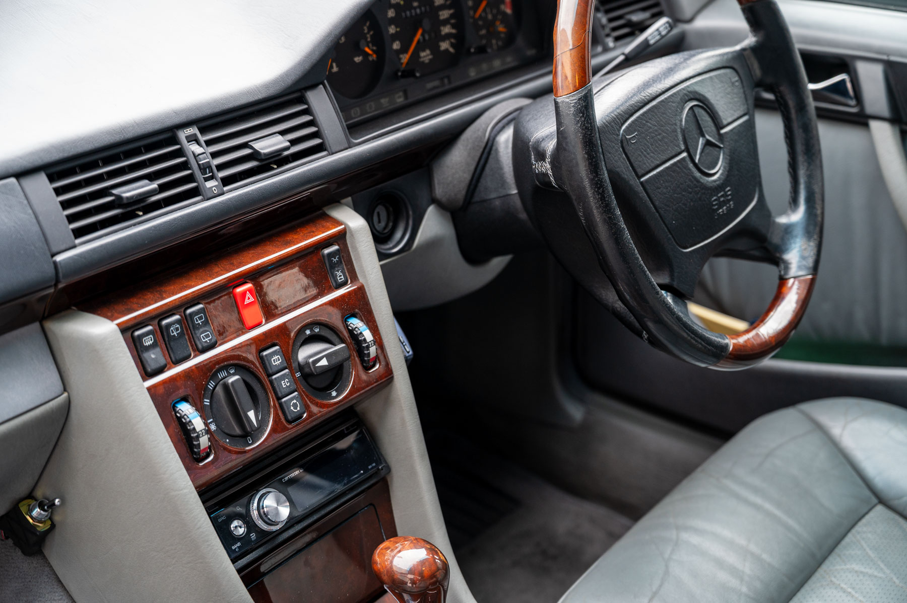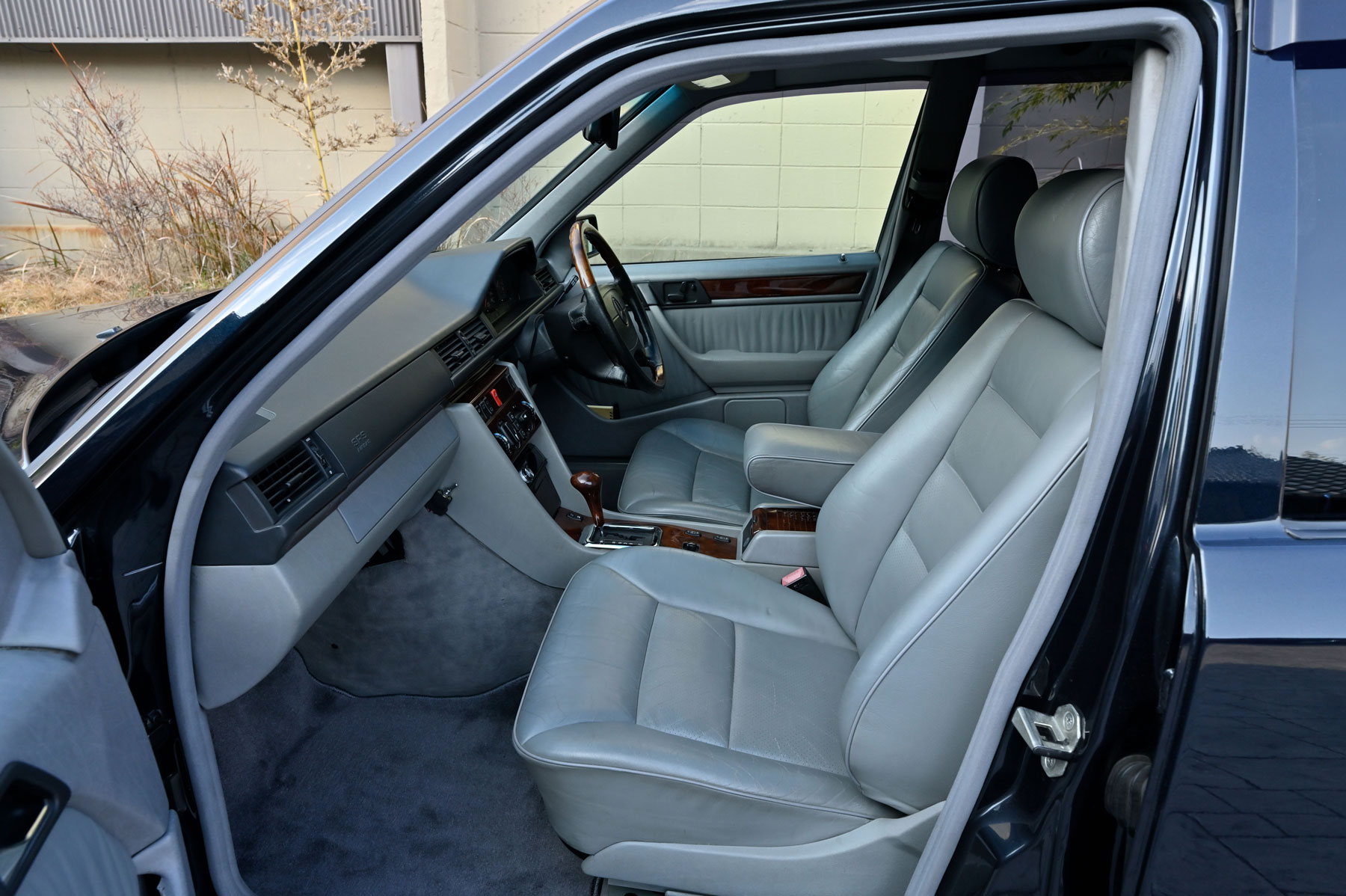 車体番号から1995年モデルを確認しております。これはW124、S124シリーズのラストイヤー、また最終リリースされた「リミテッド」グレード、リミテッド専用色サファイヤブラックです。一見濃紺にも見えますね。専用のインテリア、ウッドハンドル仕様も維持。目を引く低い外観は、AMGモデルで当時少数輸入されたE36のパーツでカスタムされています。E36用ラバー製オーバーフェンダーは装着されていないものの、非常に上質なカスタム、実は超空力デザインの124の特徴を引き立てる良い雰囲気です。アイバッハ製スプリングで少しローダウンされています。強固なシャシーとの相性も悪くない印象。